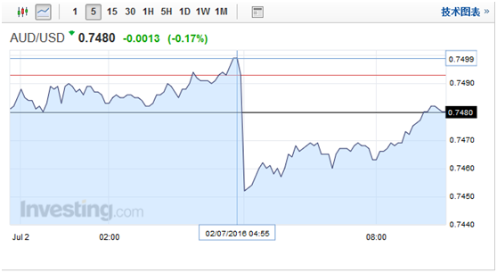 大選膠著態(tài)勢凸顯后,澳元/美元即可下跌超0.6%,隨后緩慢有所回升,現(xiàn)報0.7480,但依然有約0.25%的跌幅。