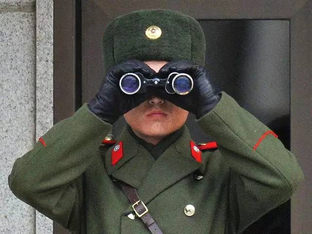 板門店,朝鮮人民軍士兵查看著韓國方向的情況。