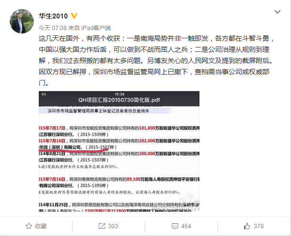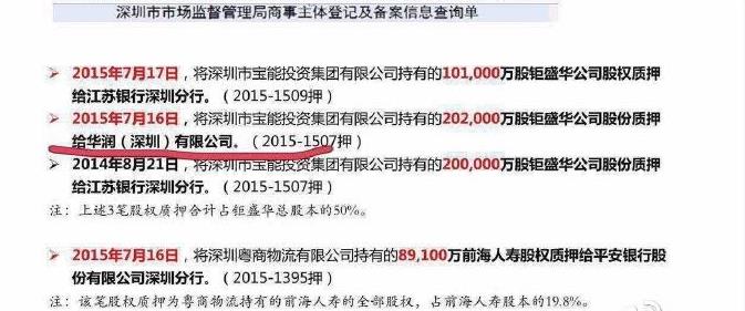 21世紀(jì)經(jīng)濟(jì)報(bào)道也提及了此次質(zhì)押,稱其所指為2015年7月16日,寶能投資集團(tuán)曾將其持有的鉅盛華公司20.2億股質(zhì)押給華潤(rùn)(深圳)有限公司,(2015-1507押):(下圖來自認(rèn)證為美林國際(香港)有限公司執(zhí)行董事劉芮東的微博)
