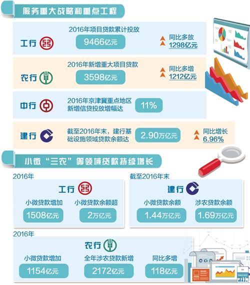 “一帶一路”建設(shè)以及京津冀協(xié)同發(fā)展、長江經(jīng)濟(jì)帶等重大戰(zhàn)略相關(guān)項(xiàng)目和工程一直是銀行業(yè)的重點(diǎn)業(yè)務(wù)。年報(bào)顯示,2016年,工商銀行積極服務(wù)重大戰(zhàn)略和重點(diǎn)工程,項(xiàng)目貸款累計(jì)投放9466億元,同比多放1298億元;建設(shè)銀行支持國家重大戰(zhàn)略實(shí)施,截至2016年末,基礎(chǔ)設(shè)施領(lǐng)域貸款余額達(dá)2.90萬億元,同比增長6.96%;農(nóng)業(yè)銀行2016年新增重大項(xiàng)目貸款3598億元,同比多增1212億元;中國銀行2016年京津冀重點(diǎn)地區(qū)新增信貸投放增幅達(dá)11%。