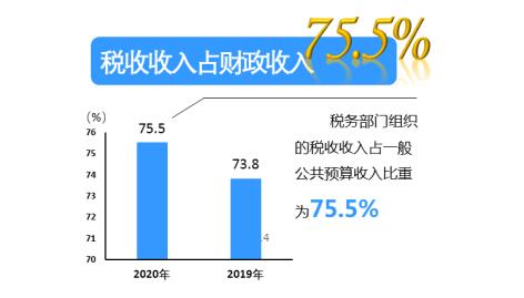 二:稅務部門組織稅收收入占財政收入的比重為75.5%,比2019年提升1.7個百分點。2020年,稅務部門組織的稅收收入占一般公共預算收入比重預計為75.5%,比2019年提升1.7個百分點。與“十二五”末的2015年相比,2020年稅收收入占財政收入比重提升了2.9個百分點,顯示“十三五”時期稅收為國聚財職能持續(xù)增強。