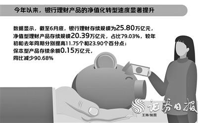 今年以來(lái),銀行理財(cái)產(chǎn)品的凈值化轉(zhuǎn)型速度顯著提升。銀行業(yè)理財(cái)?shù)怯浲泄苤行陌l(fā)布《中國(guó)銀行業(yè)理財(cái)市場(chǎng)半年報(bào)告(2021年上)》報(bào)告顯示,截至6月底,銀行理財(cái)存續(xù)規(guī)模為25.80萬(wàn)億元,凈值型理財(cái)產(chǎn)品存續(xù)規(guī)模20.39萬(wàn)億元,占比79.03%,較年初和去年同期分別提高11.75個(gè)和23.90個(gè)百分點(diǎn);保本型產(chǎn)品存續(xù)余額0.15萬(wàn)億元,同比減少90.68%。