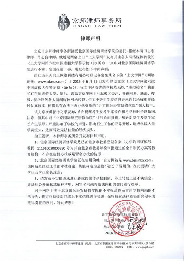 在披露第六批虛假大學(xué)名單的時候,因語言表述邏輯錯誤,致使身為正規(guī)大學(xué)的北京國際經(jīng)貿(mào)研修學(xué)院“躺槍”。為此,北京國際經(jīng)貿(mào)研修學(xué)院于6月28日下午發(fā)表《律師聲明》,欲通過法律途徑追究上大學(xué)網(wǎng)的侵權(quán)責(zé)任。