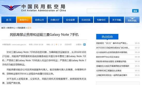 據中國民航局官網10月26日消息,針對三星Galaxy Note 7手機存在的問題,為確保航空運輸安全,從2016年10月27日起,民航局嚴禁旅客和機組成員隨身或在手提行李中攜帶三星Galaxy Note 7手機;嚴禁將三星Galaxy Note 7手機放入托運行李中托運;嚴禁將三星Galaxy Note 7手機作為航空貨物收運。