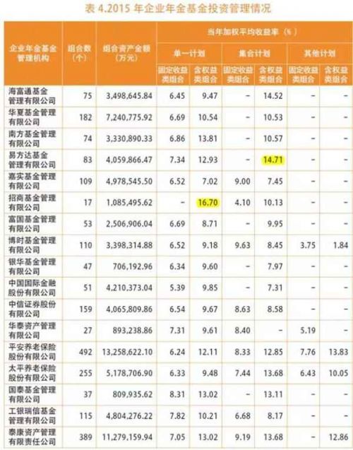 就具體的投資管理公司來看,目前共有20家金融機構(gòu)擁有企業(yè)年金的投資管理資格,其中基金公司共有11家,券商和保險公司合計共9家。就投資收益率來看,在單一計劃的權(quán)益類產(chǎn)品中,招商基金獲取16.7%年度加權(quán)平均收益率,排名第一;在集合計劃的權(quán)益類產(chǎn)品中,易方達(dá)基金以14.71%的收益率位居榜首。