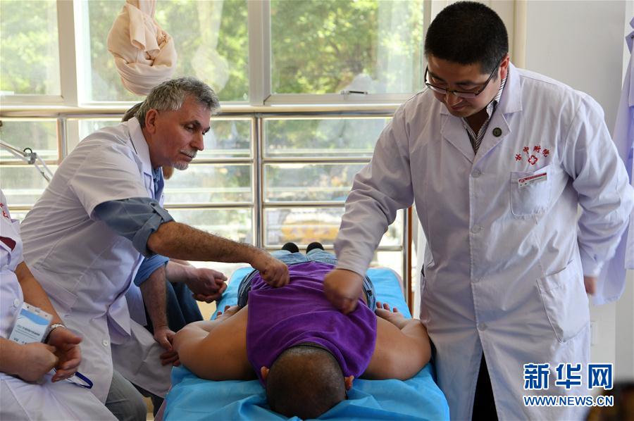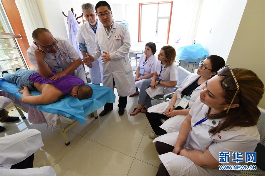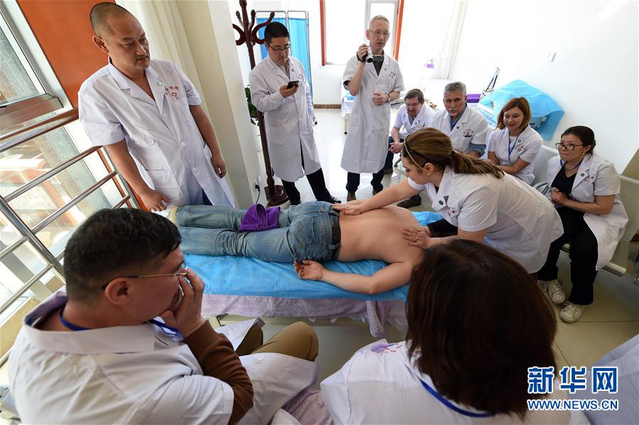 5月12日,在甘肅省中醫(yī)藥大學附屬醫(yī)院中醫(yī)綜合治療區(qū),中方醫(yī)師周強向俄羅斯學員介紹推拿技巧。當日,來自俄羅斯友誼大學東方醫(yī)學院的12位學員在甘肅省中醫(yī)藥大學附屬醫(yī)院中醫(yī)綜合治療區(qū)開展推拿、拔火罐的學習與實踐。這批學員在甘肅參加由甘肅省衛(wèi)生計生委主辦的俄羅斯中醫(yī)研修班,為期半個月。據(jù)了解,甘肅省衛(wèi)生計生委、甘肅省中醫(yī)藥大學附屬醫(yī)院截至目前已合作培訓來自“一帶一路”沿線國家的中醫(yī)研修班學員100余人次。新華社記者 范培珅 攝