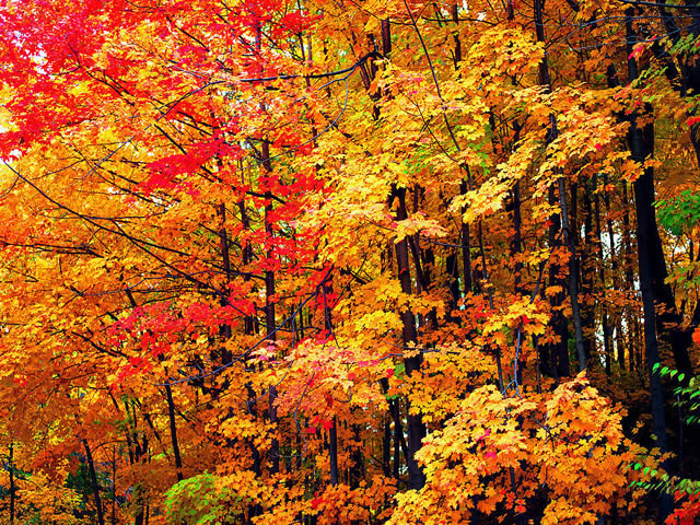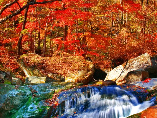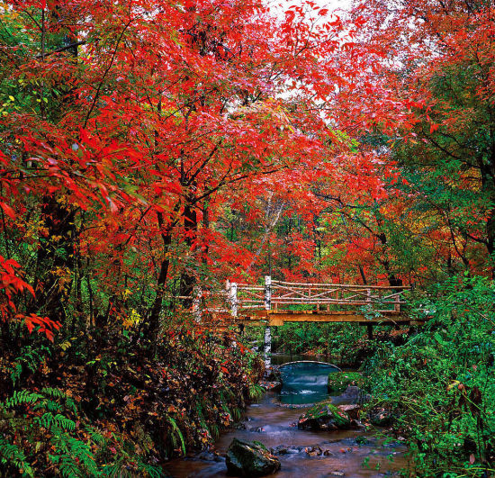 天橋溝國家森林公園享有“遼東小廬山”的美稱,大片的楓葉火紅艷麗,形成秋色主調(diào)。由于剛剛開發(fā),秋色濃烈純凈,自然狀態(tài)相當(dāng)完好。