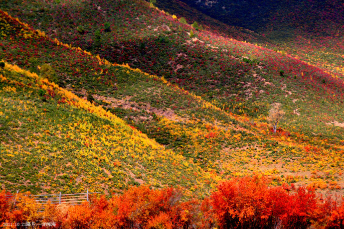 這里有廣闊而美麗的草原,生長著滿山的莨茗紅葉,色彩濃艷夸張,而被紅浪所包圍的藏民村莊、田野,則顯得非常的樸素和安祥。