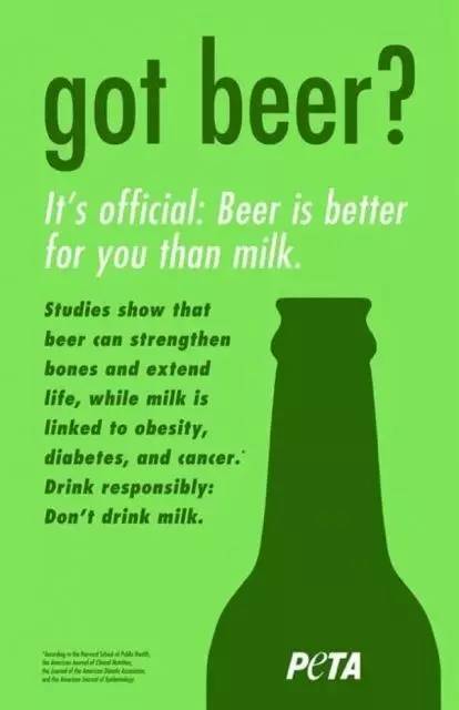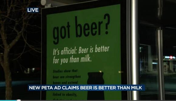 善待動物組織(PETA)是一家總部位于美國弗吉尼亞的非政府組織。最近,他們在威斯康辛大學(xué)麥迪遜分校附近投放了一則平面廣告,號稱“和牛奶相比,啤酒其實對你更有益”。