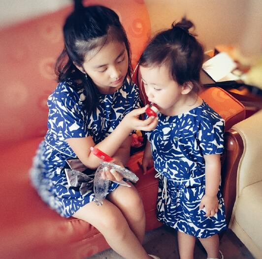 照片中,多多一手拿著小鏡子,一手拿著口紅,耐心的幫妹妹涂抹。兩人還穿著姐妹裝,畫面十分有愛溫暖!