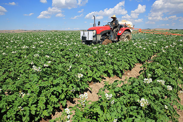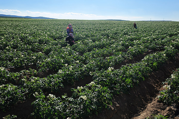 7月19日,在甘肅省定西市安定區(qū)香泉鎮(zhèn)馬鈴薯種植基地,農(nóng)民在進(jìn)行馬鈴薯田間管理。