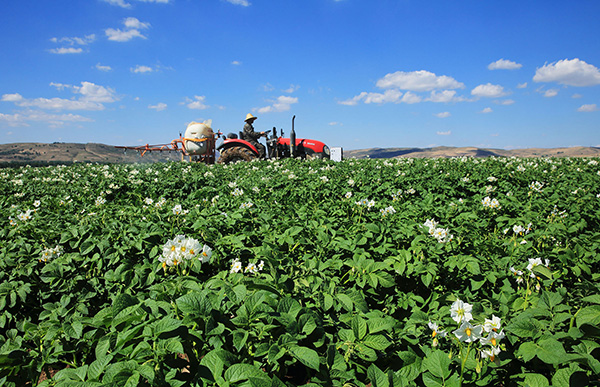 7月19日,在甘肅省定西市安定區(qū)香泉鎮(zhèn)馬鈴薯種植基地,農(nóng)民駕駛農(nóng)機(jī)為馬鈴薯噴灑農(nóng)藥。