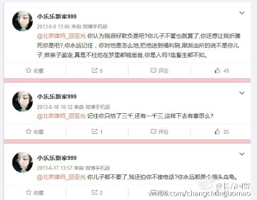 知名博主“長春國貿(mào)”通過微博曝出一些關(guān)于疑似邵亞光相關(guān)信息。一位名為“小樂樂新家999”的網(wǎng)友長期在微博中和邵亞光“撕逼”,稱邵亞光不管兒子,將兒子送到福利院,并跟警察稱不是他兒子。