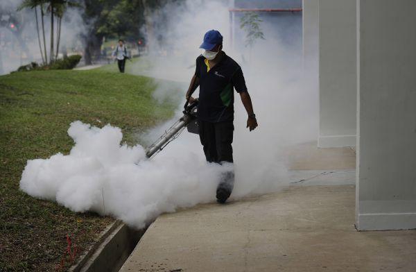 新加坡衛(wèi)生防疫人員在在噴灑驅(qū)蟲藥。