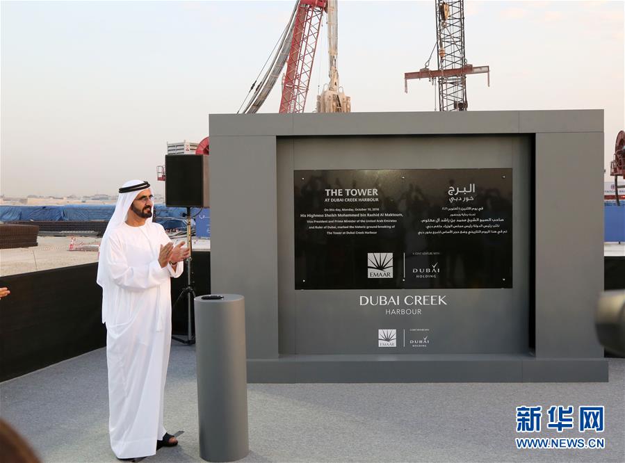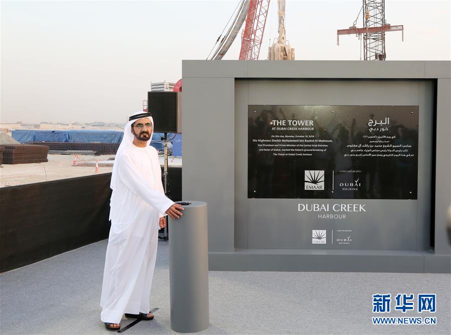 10月10日,在阿聯(lián)酋迪拜,阿聯(lián)酋副總統(tǒng)兼總理、迪拜酋長(zhǎng)穆罕默德·本·拉希德·阿勒馬克圖姆為未來(lái)“世界最高塔”啟動(dòng)奠基儀式。