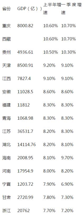 緊隨其后的是西藏和貴州,這兩個(gè)省份經(jīng)濟(jì)增速也都在10%以上。其中毗鄰重慶的貴州上半年GDP為4936.61億元,比上年同期增長(zhǎng)10.5%。