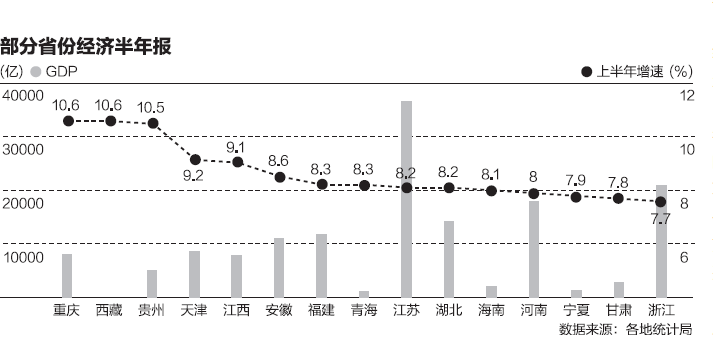 在國(guó)家統(tǒng)計(jì)局公布上半年全國(guó)經(jīng)濟(jì)數(shù)據(jù)后,各地統(tǒng)計(jì)局也紛紛披露了自己的“半年報(bào)”。從已公布的27個(gè)省份的數(shù)據(jù)來(lái)看,重慶和西藏同以10.6%的增速領(lǐng)跑,長(zhǎng)江中上游整體表現(xiàn)仍比較強(qiáng)勁,東北、西北等地增速比較靠后。