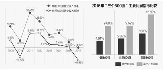 500強(qiáng)的營(yíng)業(yè)收入很高,但盈利能力落后于美國(guó)。中國(guó)500強(qiáng)營(yíng)業(yè)收入利潤(rùn)率、凈資產(chǎn)利潤(rùn)率分別為4.61%和9.6%,分別比美國(guó)500強(qiáng)低2.39和3.09個(gè)百分點(diǎn)。在2016世界500強(qiáng)中,美國(guó)企業(yè)的營(yíng)業(yè)收入利潤(rùn)率、凈資產(chǎn)利潤(rùn)率分別為8.05%、14.37%,但中國(guó)內(nèi)地企業(yè)卻只有5.42%、9.86%,也遠(yuǎn)低于美國(guó)大企業(yè)。