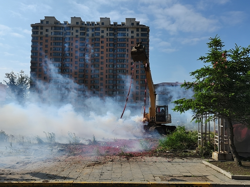 開工現(xiàn)場機器轟鳴,挖土,拆除、清理、運送。工作人員在場地中不停穿梭,眼前一片繁忙景象。