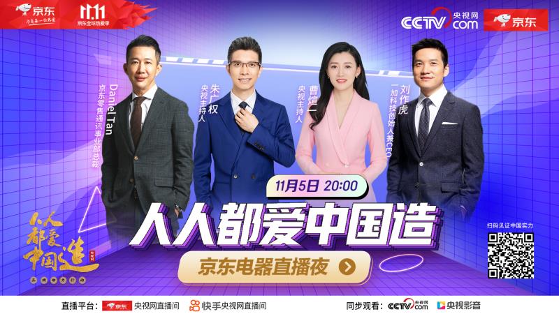 11月5日晚8點(diǎn),央視網(wǎng)“人人都愛中國造”京東專場直播,與您不見不散。屆時請關(guān)注央視網(wǎng)、央視影音、手機(jī)電視、中國互聯(lián)網(wǎng)電視參與互動,歡迎在京東央視網(wǎng)直播間、快手央視網(wǎng)直播間同步下單,驚喜折扣等您來搶。