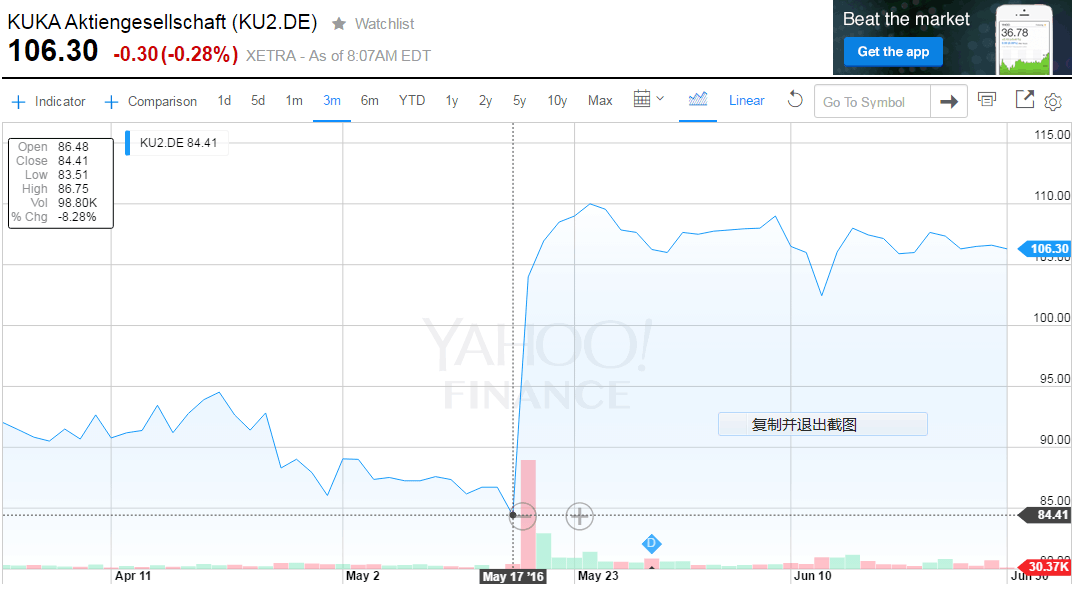 美的宣布收購庫卡的消息一出,庫卡股價立馬飆升34%,達到了驚人的112.7歐元。這一數(shù)據(jù)已經(jīng)基本與美的的收購價持平。