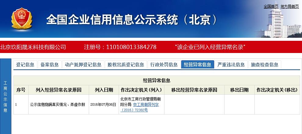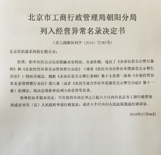 北京工商行政管理局朝陽(yáng)分局表示,北京玖陽(yáng)晟禾科技公司隱瞞真實(shí)情況、弄虛作假,違反了《企業(yè)信息公示暫行條例》好《企業(yè)經(jīng)營(yíng)異常名錄管理暫行辦法》的相關(guān)規(guī)定。決定將玖陽(yáng)晟禾列入經(jīng)營(yíng)異常名錄。