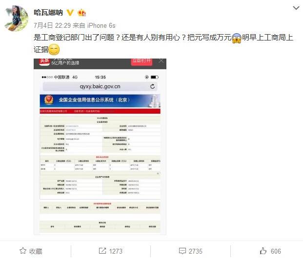 對(duì)此,田樸珺7月4日晚間在微博上回應(yīng)稱,“是工商登記部門出了問題?還是有人別有用心?把元寫成萬元,明早上工商局上證據(jù)?!?/p>