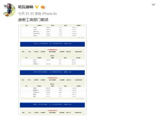 今天凌晨,田樸珺也發(fā)表微博稱,“感謝工商部門勘誤”。