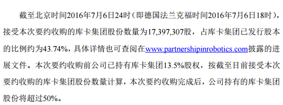 7月7日下午,美的公告了此事的最新進展。美的稱,截至北京時間2016年7月6日24時(即德國法蘭克福時間2016年7月6日18時),接受本次要約收購的庫卡集團股份數(shù)量為17,397,307股,占庫卡集團已發(fā)行股本的比例約為43.74%。