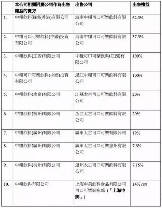 根據(jù)中國食品隨后給出的名單,它們正是10家可口可樂和中糧的裝瓶工廠(如下圖)——公司擬出售海南中糧可口可樂飲料、中糧可口可樂飲料(江西)、湛江中糧可口可樂飲料、江蘇太古可口可樂飲料、浙江太古可口可樂飲料、廣東太古可口可樂、溫州太古可口可樂飲料、上海申美飲料食品的部份或全部股權(quán)。