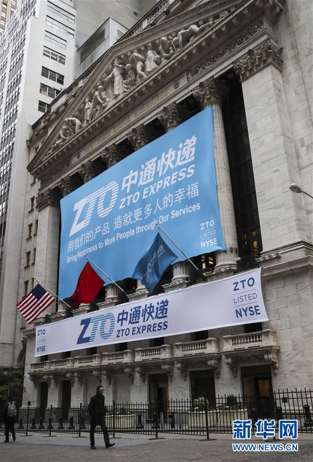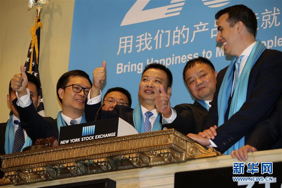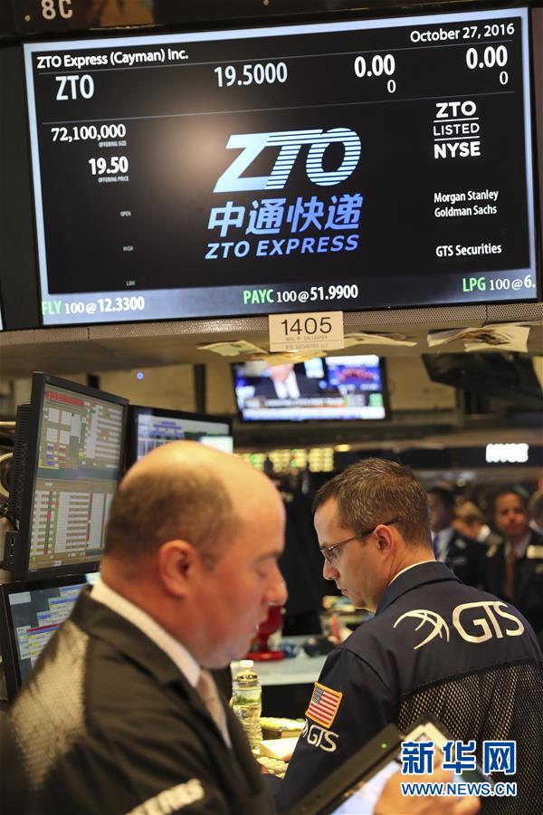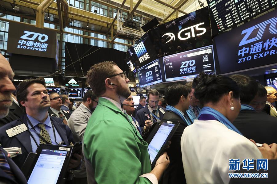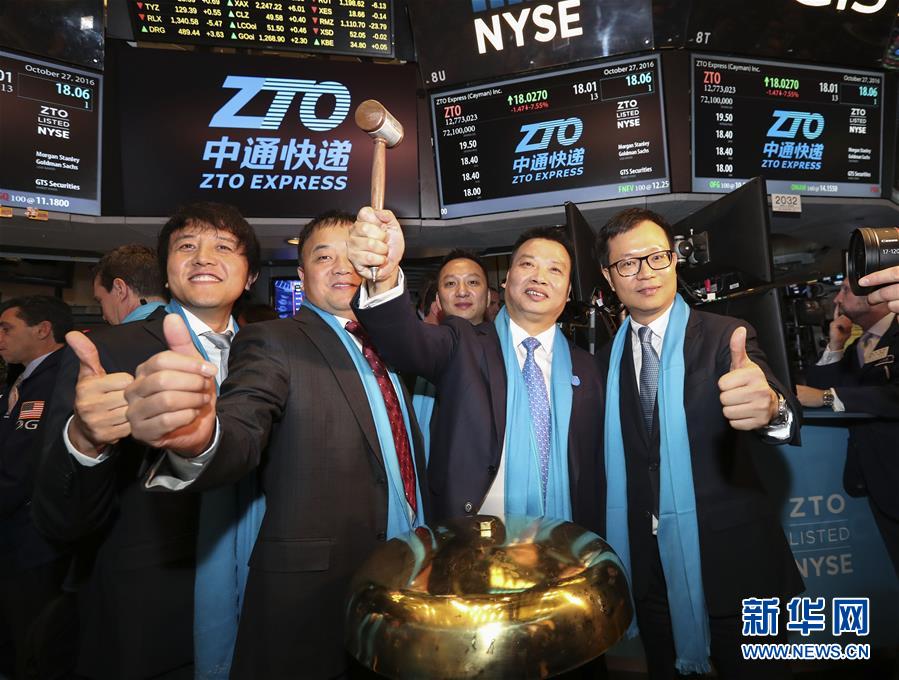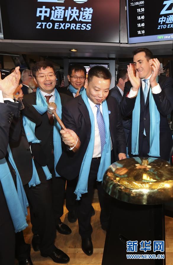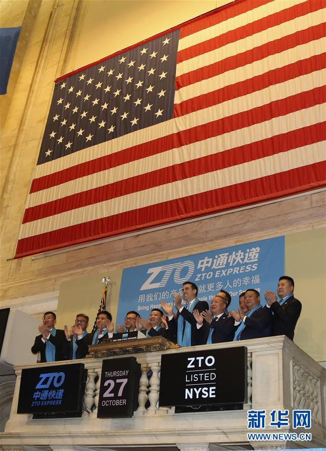10月27日,在美國紐約證券交易所,中通快遞創(chuàng)始人、董事長賴梅松(右三)等嘉賓參加紐交所開市鐘敲響儀式。中國中通快遞27日正式在美國紐約證券交易所掛牌交易,成為繼2014年阿里巴巴在美首次公開募股(IPO)之后最大規(guī)模的中國企業(yè)赴美融資案例,也是截至目前今年美國資本市場規(guī)模最大的IPO。新華社記者 王迎 攝