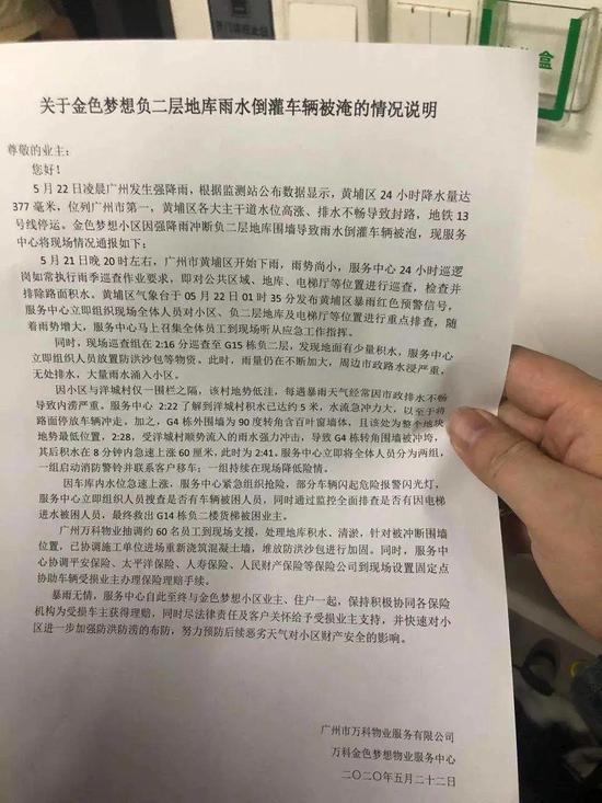 網(wǎng)友@波波沙 是廣州萬科金色夢想小區(qū)的業(yè)主之一,也是受災(zāi)車主之一。