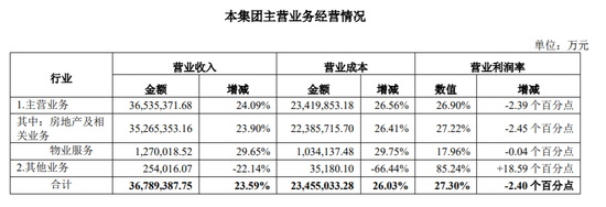 萬科2019年年報顯示,來自房地產(chǎn)及相關(guān)業(yè)務(wù)的營業(yè)收入3526.5億元,占比95.9%,來自物業(yè)服務(wù)的營業(yè)收入127.0億元,占比3.5%。