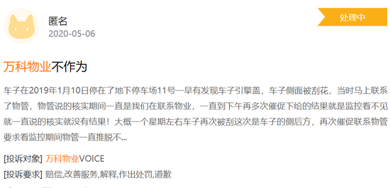 深藍財經(jīng)在黑貓投訴平臺上也發(fā)現(xiàn)了不少關(guān)于萬科物業(yè)的投訴。
