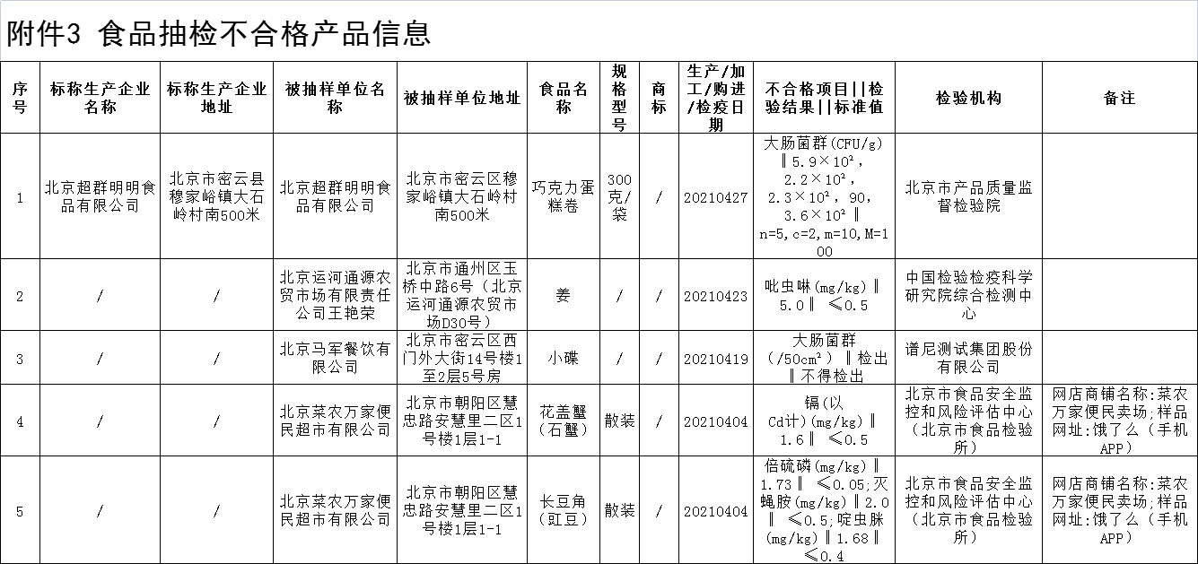 4.菜農(nóng)萬(wàn)家便民賣(mài)場(chǎng)(經(jīng)營(yíng)者為北京菜農(nóng)萬(wàn)家便民超市有限公司)在餓了么(手機(jī)APP)銷(xiāo)售的花蓋蟹(石蟹)中鎘(以Cd計(jì))不符合食品安全國(guó)家標(biāo)準(zhǔn),長(zhǎng)豆角(豇豆)中倍硫磷、滅蠅胺、啶蟲(chóng)脒不符合食品安全國(guó)家標(biāo)準(zhǔn)。檢驗(yàn)機(jī)構(gòu)為北京市食品安全監(jiān)控和風(fēng)險(xiǎn)評(píng)估中心(北京市食品檢驗(yàn)所)。