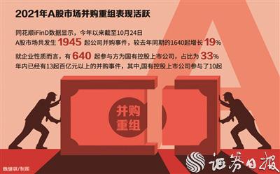 2021年A股市場(chǎng)并購重組表現(xiàn)活躍?!蹲C券日?qǐng)?bào)》記者據(jù)同花順iFinD數(shù)據(jù)統(tǒng)計(jì),按首次公告日并剔除交易失敗案例來看,今年以來截至10月24日,A股市場(chǎng)共發(fā)生1945起公司并購事件,較去年同期的1640起增長19%。就企業(yè)性質(zhì)而言,有640起參與方為國有控股上市公司,占比為33%。