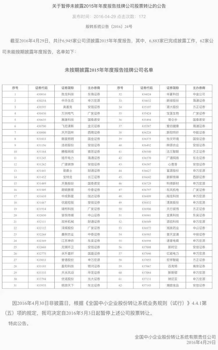 股轉(zhuǎn)表示,因2016年4月30日非披露日,根據(jù)《全國中小企業(yè)股份轉(zhuǎn)讓系統(tǒng)業(yè)務(wù)規(guī)則(試行)》4.4.1第(五)項的規(guī)定,決定自2016年5月3日起暫停上述公司股票轉(zhuǎn)讓。