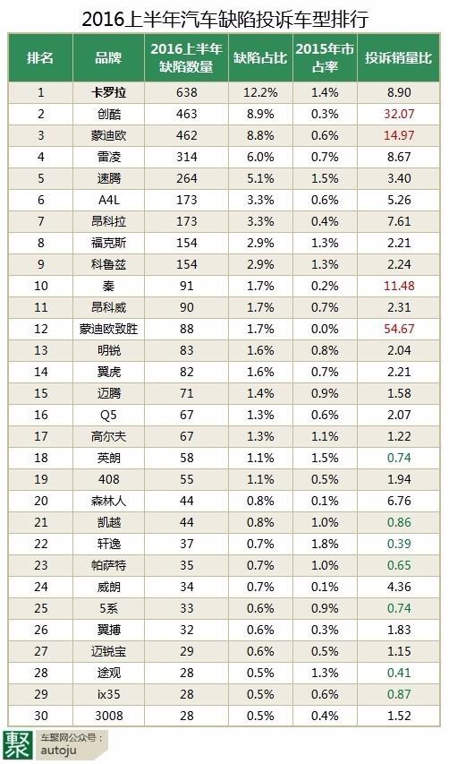讀者看到這里可能會(huì)說,為啥落下第2名不說?這張面孔在第一季度榜單上并未出現(xiàn)——雪佛蘭創(chuàng)酷,但是上半年卻以463例僅次于卡羅拉,輪胎問題占據(jù)441例。而在“投訴銷量比”上,32%僅次于致勝。