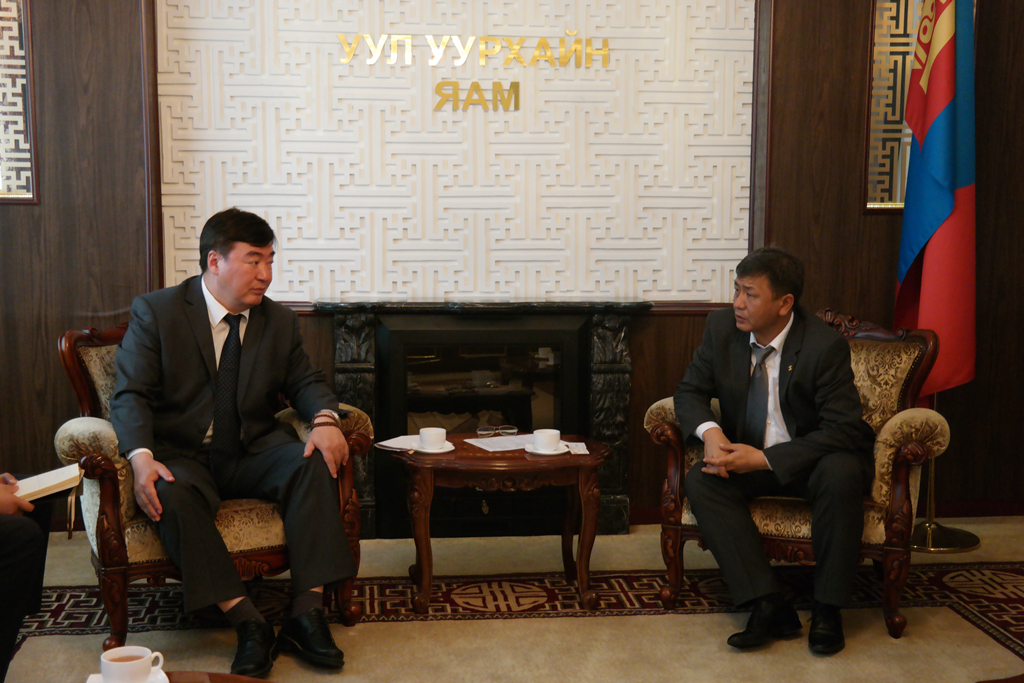 2016年8月,中國駐蒙古大使邢海明(左)會見蒙古礦業(yè)和重工業(yè)部長達(dá)希道爾吉(右)