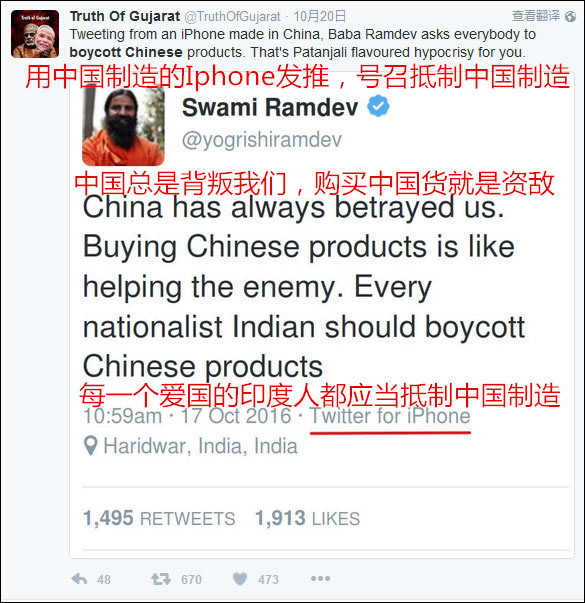 也有人諷刺印度瑜伽大師用iphone號(hào)召抵制中國制造