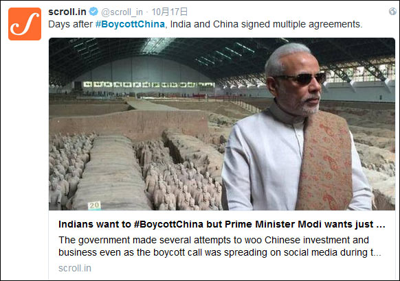 有人諷刺,民間抵制中國貨的同時(shí),莫迪訪問中國并簽訂一系列貿(mào)易協(xié)議