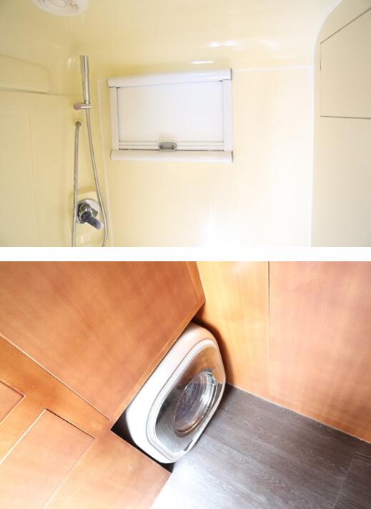房車從車門到車頭的設(shè)施配置為儲物柜組、小型洗衣機、獨立衛(wèi)浴間、廚房(帶冰箱)、卡座沙+氣動升降桌(可拼床)、額頭大床。