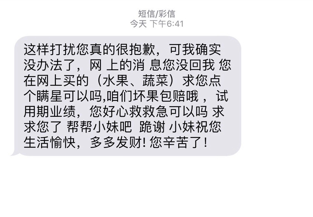 賣慘型:這樣打擾您真的很抱歉??晌掖_實沒辦法了,您在網(wǎng)上買的水果求您點個滿星可以嗎?試用期業(yè)績,求求您幫幫小妹吧,跪謝。