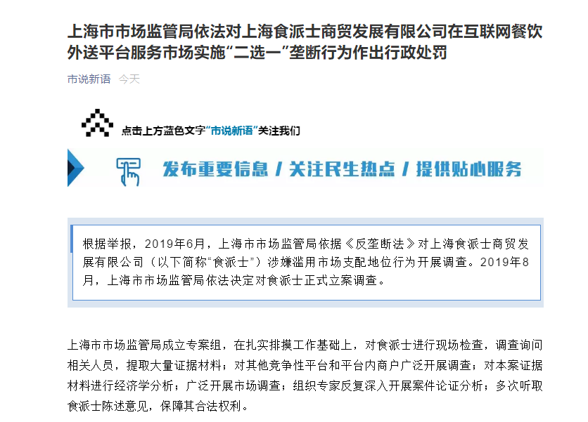 116.86萬元!食派士因?qū)嵤?ldquo;二選一”壟斷行為被罰