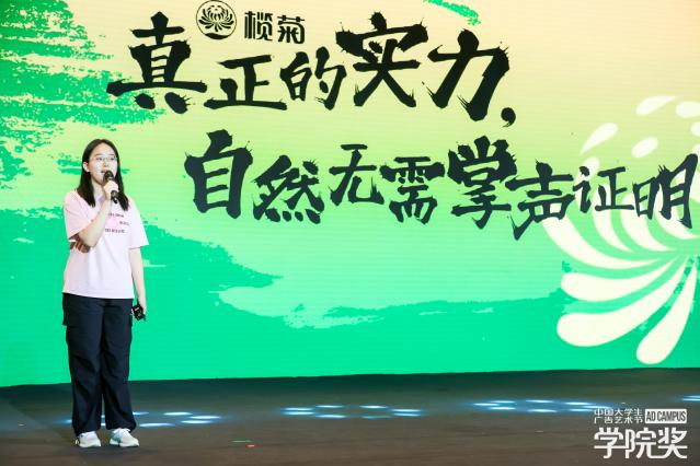 “全場(chǎng)大獎(jiǎng)”是創(chuàng)意征集賽事的至高殊榮,備受創(chuàng)意學(xué)子的關(guān)注與期待,這不僅是對(duì)青年優(yōu)秀作品的一種榮耀加冕,更是企業(yè)和行業(yè)未來創(chuàng)意發(fā)展的風(fēng)向標(biāo)。今年,欖菊文案類金獎(jiǎng)作品《見證實(shí)力無需鼓掌》憑借精妙的創(chuàng)意、豐富的內(nèi)涵成功沖刺總決賽!并由創(chuàng)作學(xué)生在青春盛典現(xiàn)場(chǎng)進(jìn)行精彩提案。