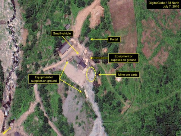 “北緯38度”系屬于約翰霍普金斯大學(xué)高等國(guó)際研究學(xué)院旗下。該網(wǎng)站展示了一些拍攝于7月7日的衛(wèi)星照片,顯示豐溪里核試驗(yàn)場(chǎng)內(nèi)出現(xiàn)了可能是礦車的器材,工作人員也正在堆疊用品或設(shè)備,這表明隧道開(kāi)鑿工作正在積極進(jìn)行中。