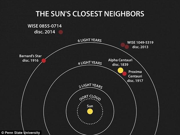 這張圖像展示的是距離太陽最近的一些恒星系統(tǒng)的位置。恒星系統(tǒng)名字后面的年份是它們的距離值被測定出來的年份