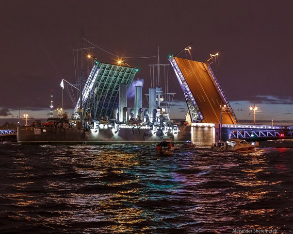 “阿芙樂爾”號花了數(shù)小時(shí),從喀瑯施塔得造船廠回到了彼得格勒的岸邊,成千上萬的市民和游客在此歡迎她的歸來。甲板上,船員們一字排開進(jìn)行站坡儀式。燈光輝映,“阿芙樂爾”號回來了。