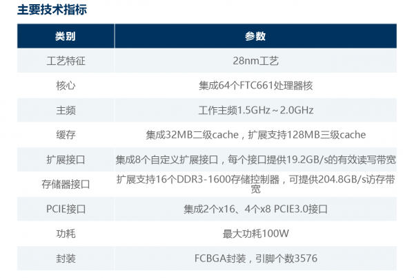 根據(jù)飛騰公司公布的資料,飛騰2000采用ARMv8指令集,集成64個自主設(shè)計的FTC661處理器核,主頻為1.5GHz~2.0GHz,制程為28nm,功耗100W。