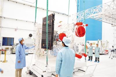 在酒泉衛(wèi)星發(fā)射中心,衛(wèi)星在安裝星箭分離解鎖機構(gòu)(2016年8月4日攝)。